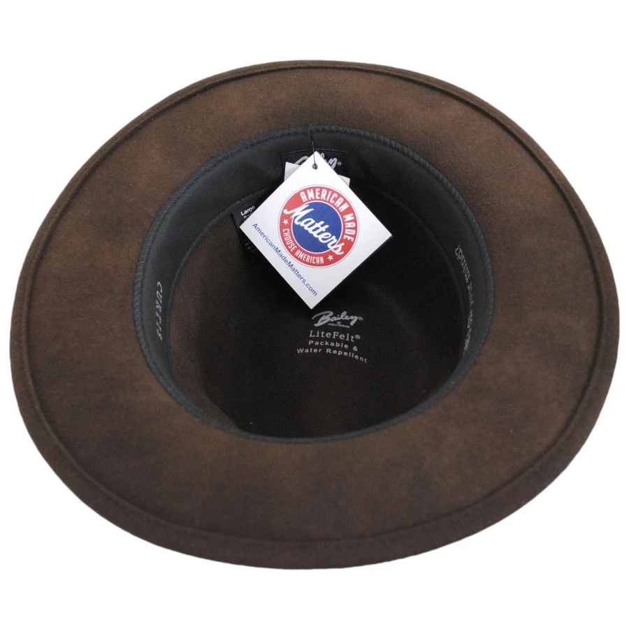 The Curtis Wool LiteFelt Safari Fedora Hat is one of the most practical hats in the Bailey line. The classically designed safari fedora repels water and oil based spills. It is breathable, and durable and can be packed for ease of travel.