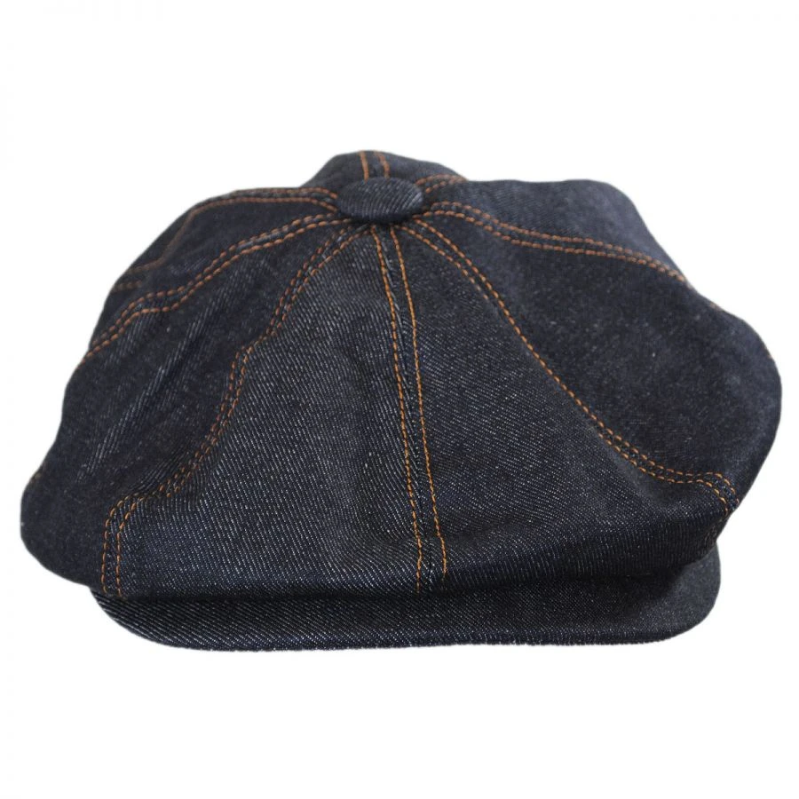 The Jaxon Denim Newsboy is an attractive dark blue denim cap constructed of comfortable, 100% cotton denim fabric. A grosgrain sweatband, satin lining and removable Jaxon side pin finely detail the 8/4 cap; its double snap brim detail helps maintain its shape.