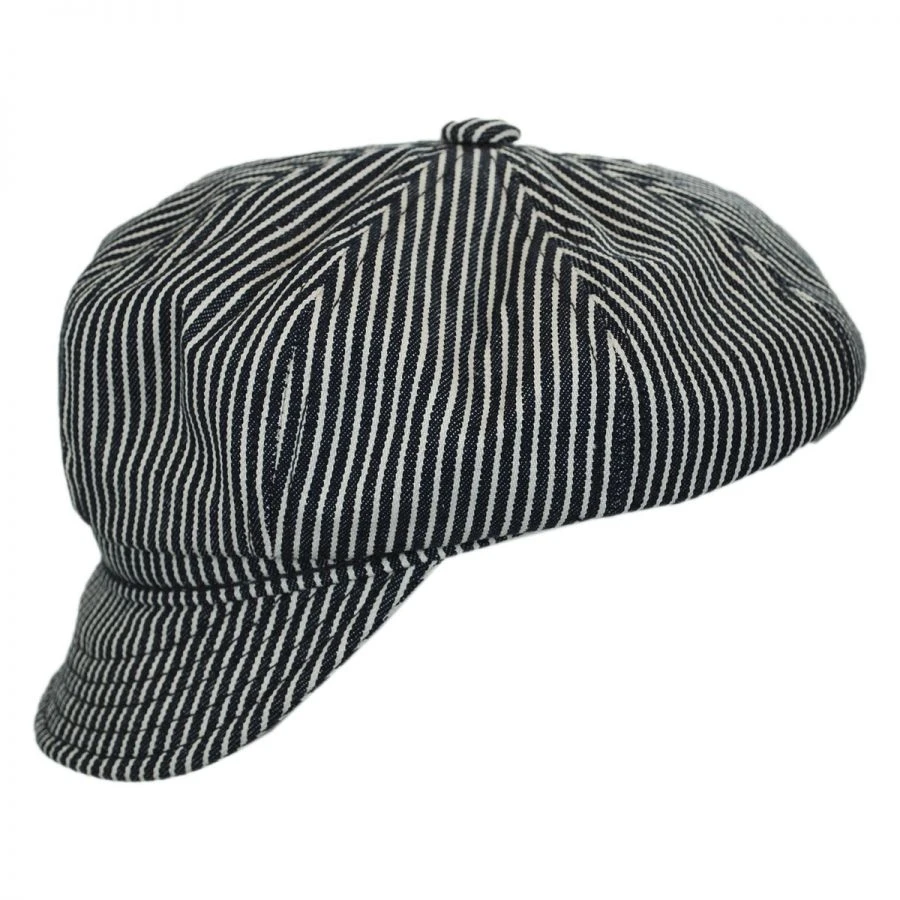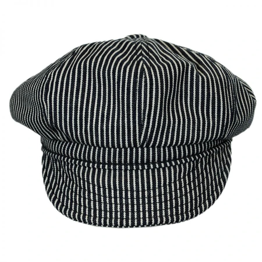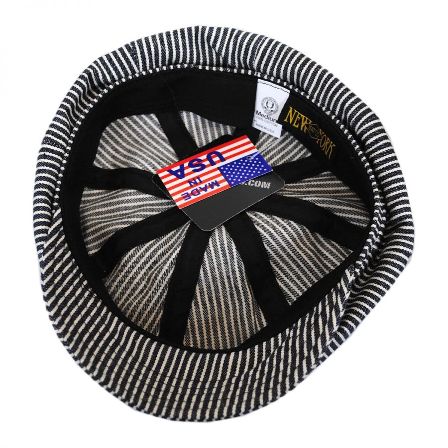 Clean navy and white pinstripes cascade down this American made newsboy cap that serves a fun twist and style to the traditional engineer hat. Hop aboard this fun new trend!