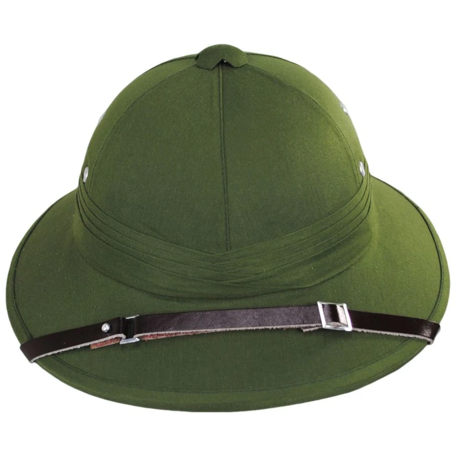 This French style pith helmet is the original design from Vietnam. A hundred years ago, the French discovered the advantages of the material used to make these hats. The pith is from trees in northern Vietnam and has properties that make it both a good sun and rain shield. These helmets are handmade in Vietnam using the techniques inherited by the former French occupiers.